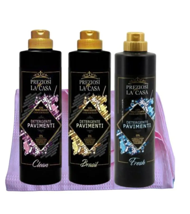 Preziosi allesreiniger set 3 flessen a 750ml en een Microvezeldoek 60×40 (kleur is afhankellijk van de voorraad roze groen of blauw)
