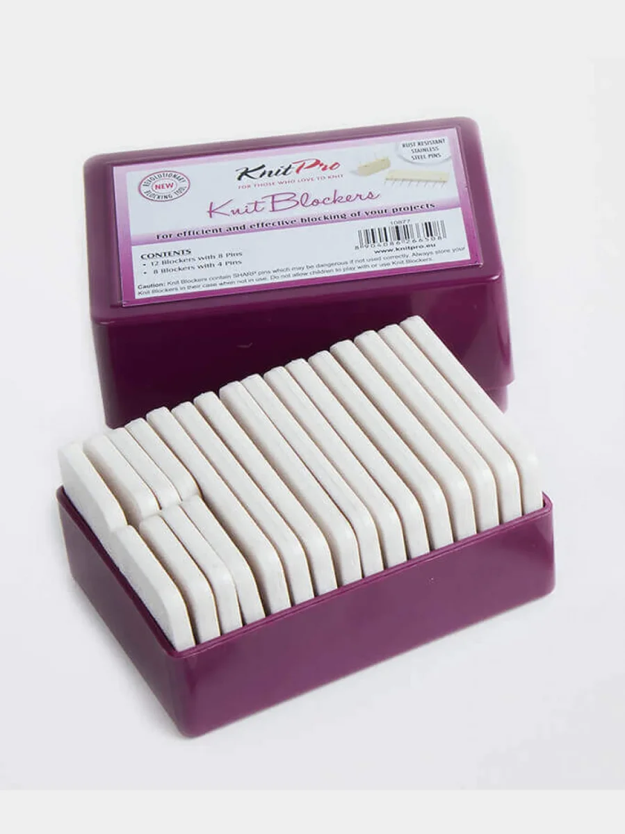 De KnitPro Knitblockers maken het veel gemakkelijker om gebreide of gehaakte werken te spannen. De handige handvatten bevatten 4 of 8 individuele naalden die in één beweging geplaatst kunnen worden. Hierdoor gaat het spannen een stuk sneller en worden de randen tegelijkertijd gelijkmatig vastgezet