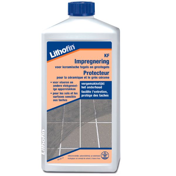 Een LITHOFIN-Lithofin KF Impregnering is een speciaal product voor keramische tegels (KF). Oplosmiddelvrije, direct verwerkbare speciale impregnering met hoogwaardige olie- en vochtwerende werkzame stoffen. De werkende stoffen dringen binnen in de ruimte van de poriën en verlenen keramische oppervlakken en hun voegen een olie- en vochtwerende finish. Daardoor wordt de gevoeligheid voor vlekken gereduceerd en wordt het verwijderen van vlekken gemakkelijker gemaakt. De beschermde oppervlakken zijn zonder wijziging van hun uiterlijk gemakkelijker in het onderhoud en minder gevoelig voor vuil. De werkzame stoffen zijn na het drogen ongevaarlijk voor de gezondheid.