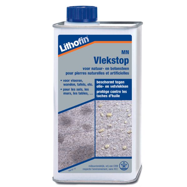 Lithofin MN Vlekstop is een speciaalproduct uit het LITHOFIN-programma voor marmer, natuur- en betonsteen (MN) Lithofin MN Vlekstop bevat hoogwaardige water- en olie-afstotende impregneerstoffen op siloxaanbasis, opgelost in oplosmiddelen. Het is dun vloeibaar, kleurloos en klaar voor gebruik.