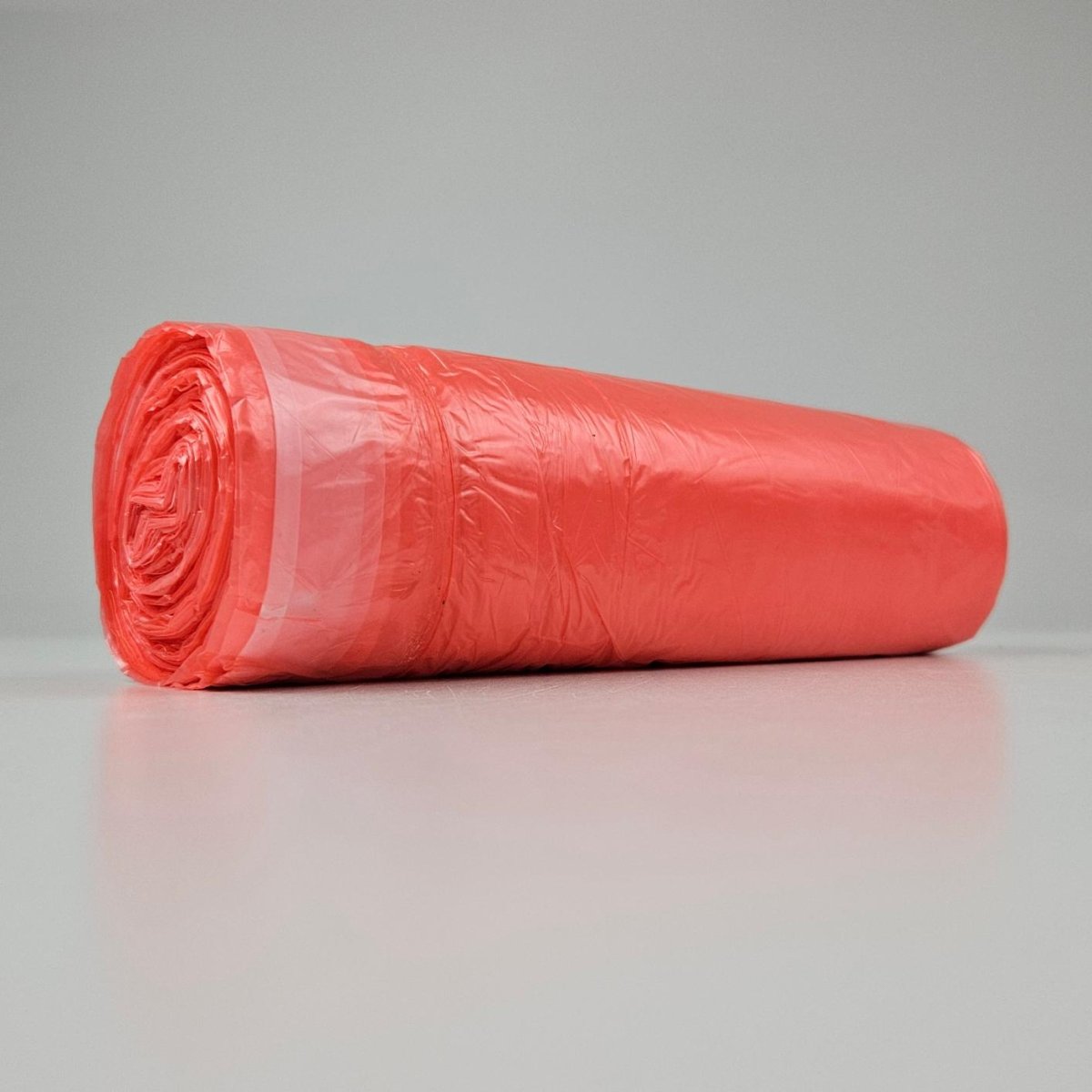 Rode pedaalemmerzakken met een treklint. Deze zakken zijn geproduceerd van 17 My dik HDPE-plastic. Ze hebben een inhoud van 30-35 liter en een afmeting van 55×70 cm. In een doos zitten 4 rollen à 25 zakken (100 zakken).