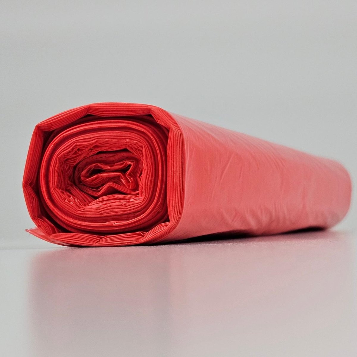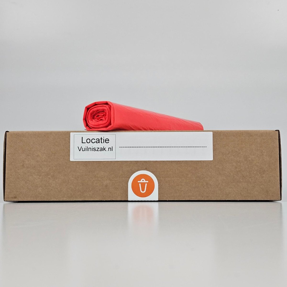 Rode vuilniszakken 70 liter vervaardigd van HDPE-plastic. De vuilniszakken hebben een afmeting van 58×100 cm en hebben een dikte van T23. Deze rode vuilniszakken worden veel gebruikt in afvalscheidingsbakken die wat smaller en hoger zijn. In een doos zitten 5 rollen à 20 zakken (100 zakken).