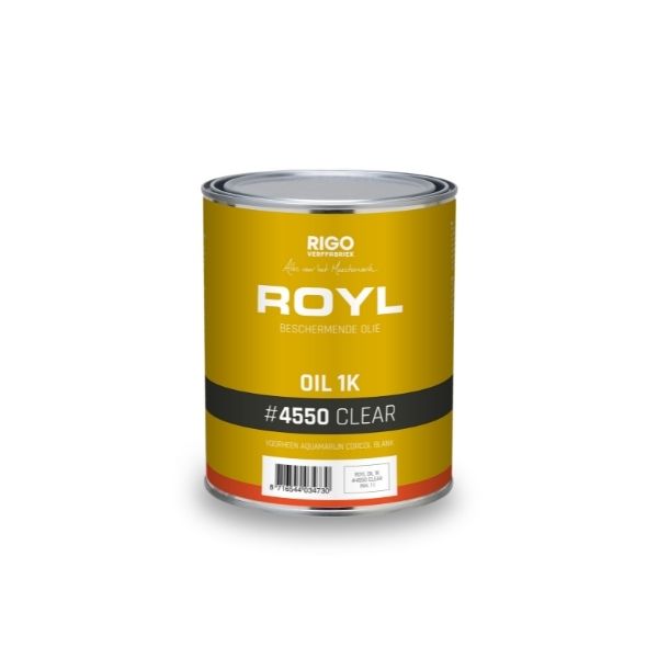 Royl Oil #4550 1K Clear 1 liter is een hoogwaardige, transparante olie op plantaardige basis die speciaal is ontwikkeld voor het afwerken en beschermen van houten vloeren, meubels en interieurhout. Deze 1-component olie is gebruiksklaar, eenvoudig te verwerken en biedt een duurzame bescherming met behoud van de natuurlijke kleur en uitstraling van het hout.