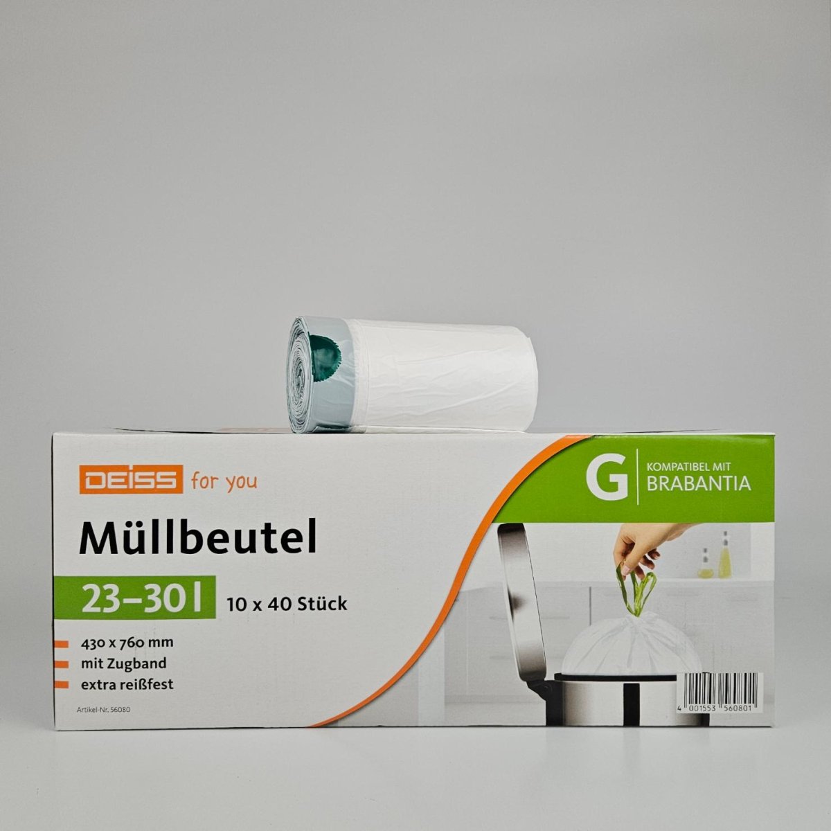 Deze 23-30 liter vuilniszakken passen in Brabantia vuilnisbakken met code G. De zakken passen onder andere in een Brabantia Touch bin 30 Liter, Classic Pedaalemmer 30 Liter en Flip Bin Afvalemmer 30 Liter. Natuurlijk passen deze zakken niet alleen in deze bakken, maar ook in veel meer afvalbakken van tussen de 23 en 30 liter.